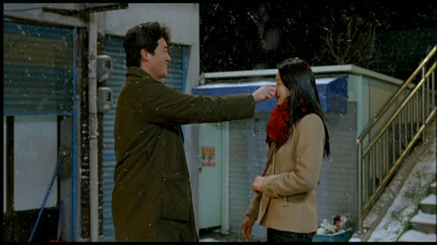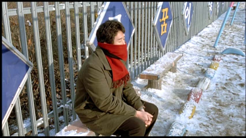 So, both of these, the cracked tooth and the dialogue on 'classiness' are the two main points of reference for determining the meaning of the film. Unlike, for instance Woman On The Beach, or The Day He Arrives, there isn't an elaborate structure of repetitions to the film from out of which to base a more complex interpretation. This film is more or less as it seems: that professor Lee, as opposed to director Kim, was always able, and is still able, to live with life that doesn't conform to what he expects (e.g., he sees his wife everyday less and less like a wife, but just as a human being). Like the triangles that are drawn in Woman On The Beach, when a series of events in our life forms the shape of an image we don't expect, one that is imperfect, we aren't able to accept it, we are repelled by it. However, in this film, for professor Lee, rather than being unable to cope with the unnatural image of a woman who is raped and 'impure', he is able to accept those aspects of her that don't conform to the normal view of womanhood or beauty (the haircut for instance) and to still take comfort in precisely that fact. The joy of, or pleasure in compromise of living our lives as they are rather than how we would prefer them to be—to believe in, as the professor tells us, nothing so that we avoid being caught up in images of how life should be that burden us and prevent us from truly experiencing what there is.
